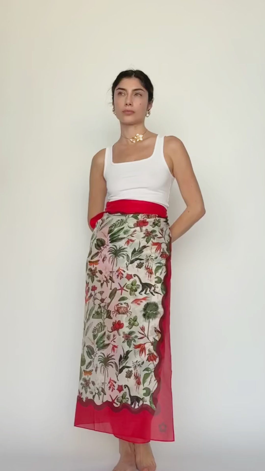 Make a statement at the beach or pool with the Isla Verde Pareo, inspired by vibrant island landscapes. Featuring rich green tones and striking red accents, this design captures the beauty of the tropics in full bloom with intricate, island-inspired illustrations. Made of a luxurious 70% cotton / 30% silk blend.